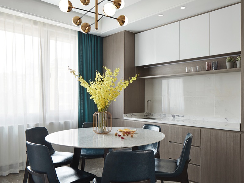 2、餐廳整體裝修風格要與相鄰空間協(xié)調,現(xiàn)代人的餐廳,大多說都是與客廳相鄰,或者融于廚房之內(nèi)的共用式餐廳,也有獨立式餐廳,獨立式客廳相對獨立,在設計的風格樣式上更加自由一些,另外,由于其空間比較大,可以增加一些其他區(qū)域設施,比如休閑的吧臺、酒柜等。而共用式餐廳重要的是設計風格與相鄰空間協(xié)調統(tǒng)一,又要從相鄰空間中獨立出來,有明顯的區(qū)分,從而顯示出功能區(qū)的不同。