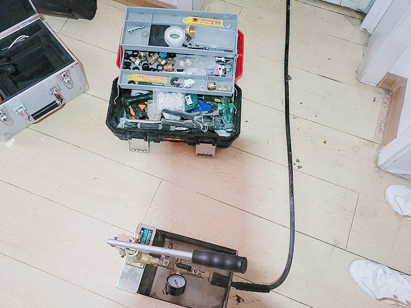 首先給大家介紹下廚房水管打壓測試怎樣檢測漏水的,在廚房水路施工完成之后需要進行水管打壓測試。水管所有的堵頭都要堵住,管道系統(tǒng)最高點安裝放氣閥,在最低點安裝泄水閥;接下來我們在水管放氣閥安裝壓力表,通過打壓機往水管內(nèi)注水,管道內(nèi)水滿后要將泄氣閥關(guān)閉。